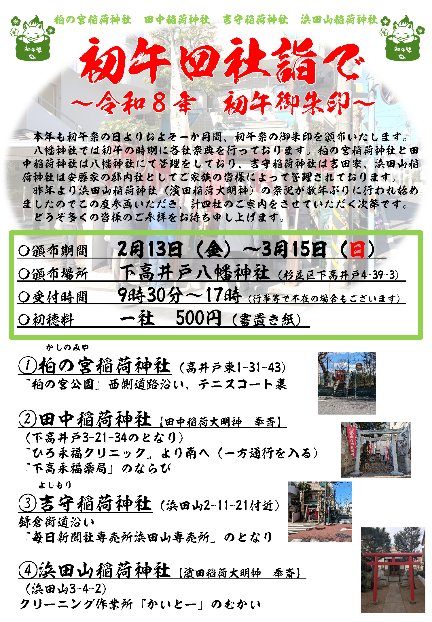 昨年より浜田山稲荷神社(濱田稲荷大明神)の祭祀が数年ぶりに行われ始めましたのでこの度参画いただき、計四社のご案内をさせていただく次第です。